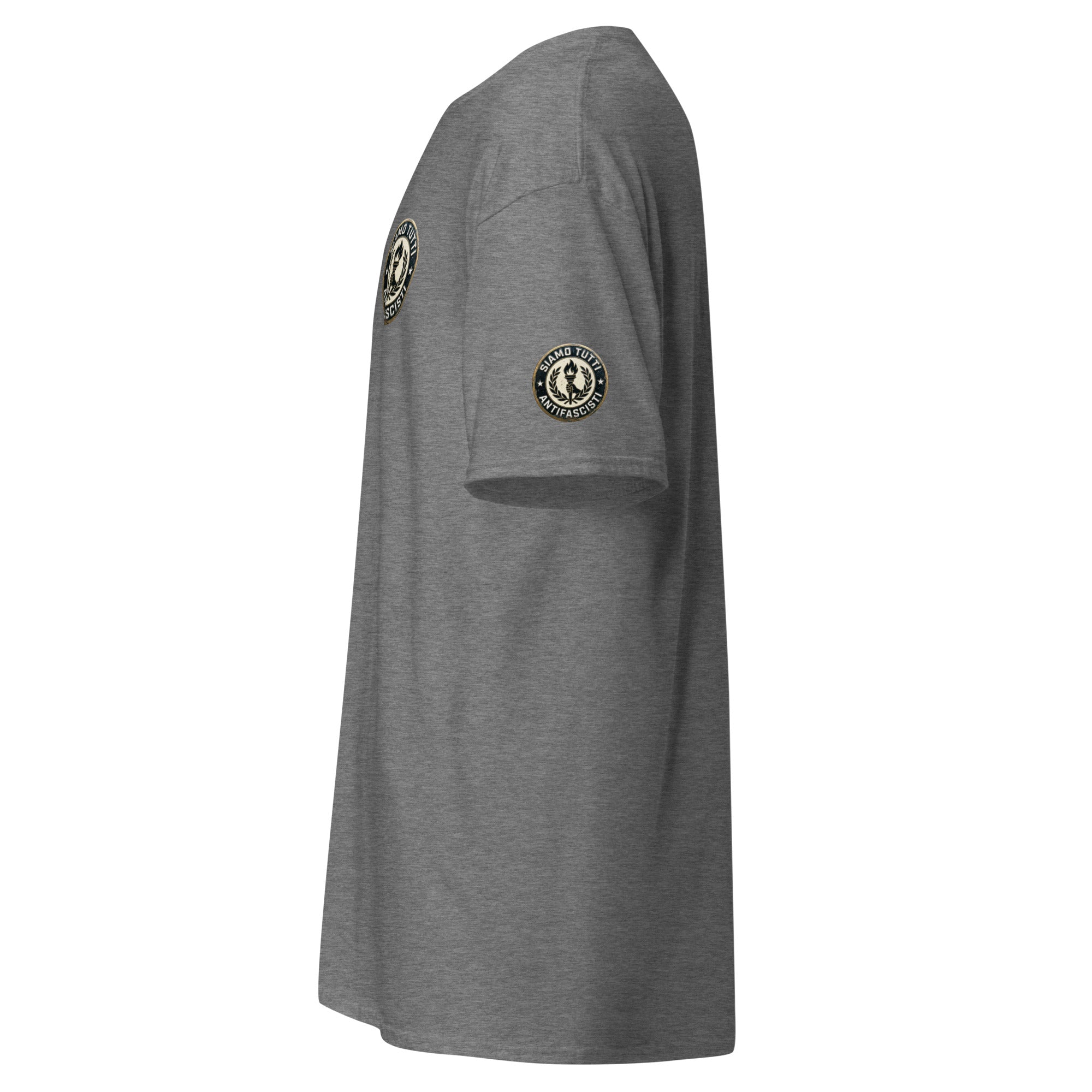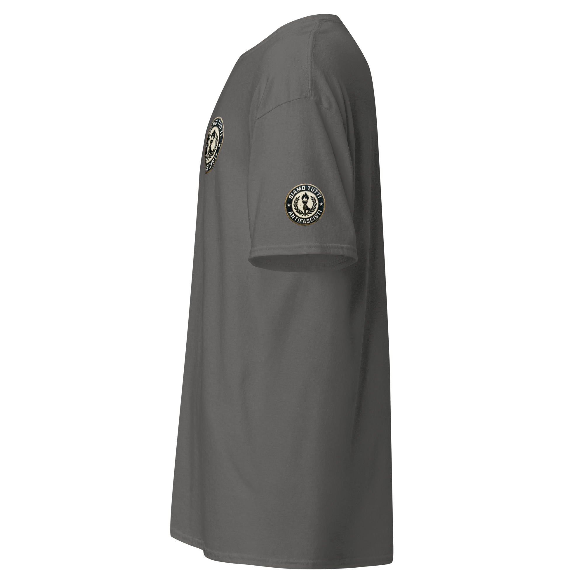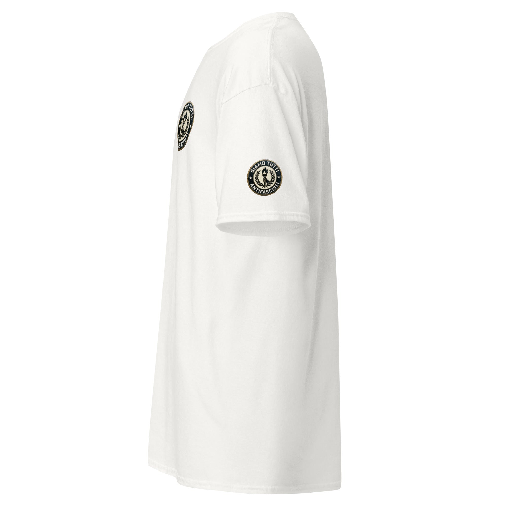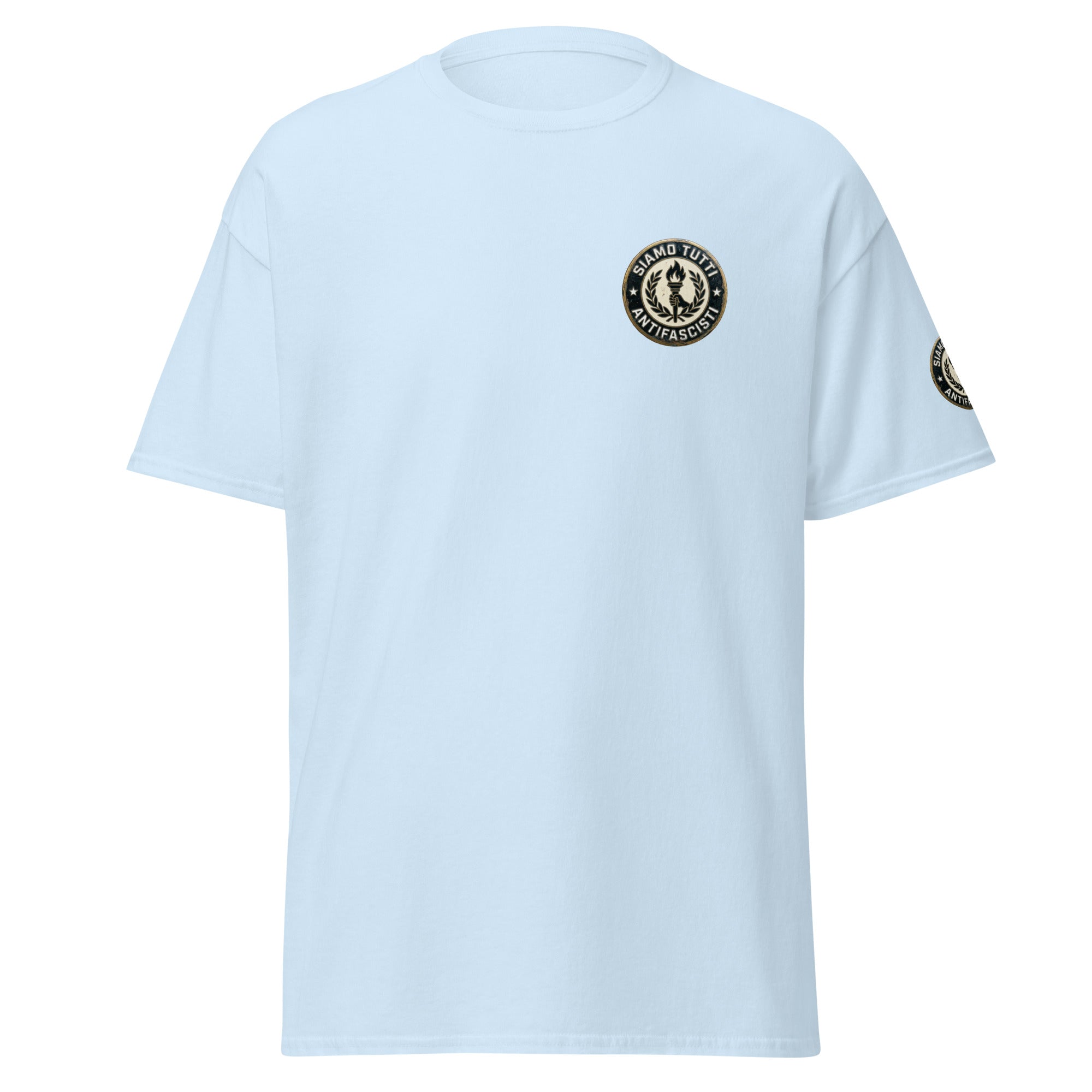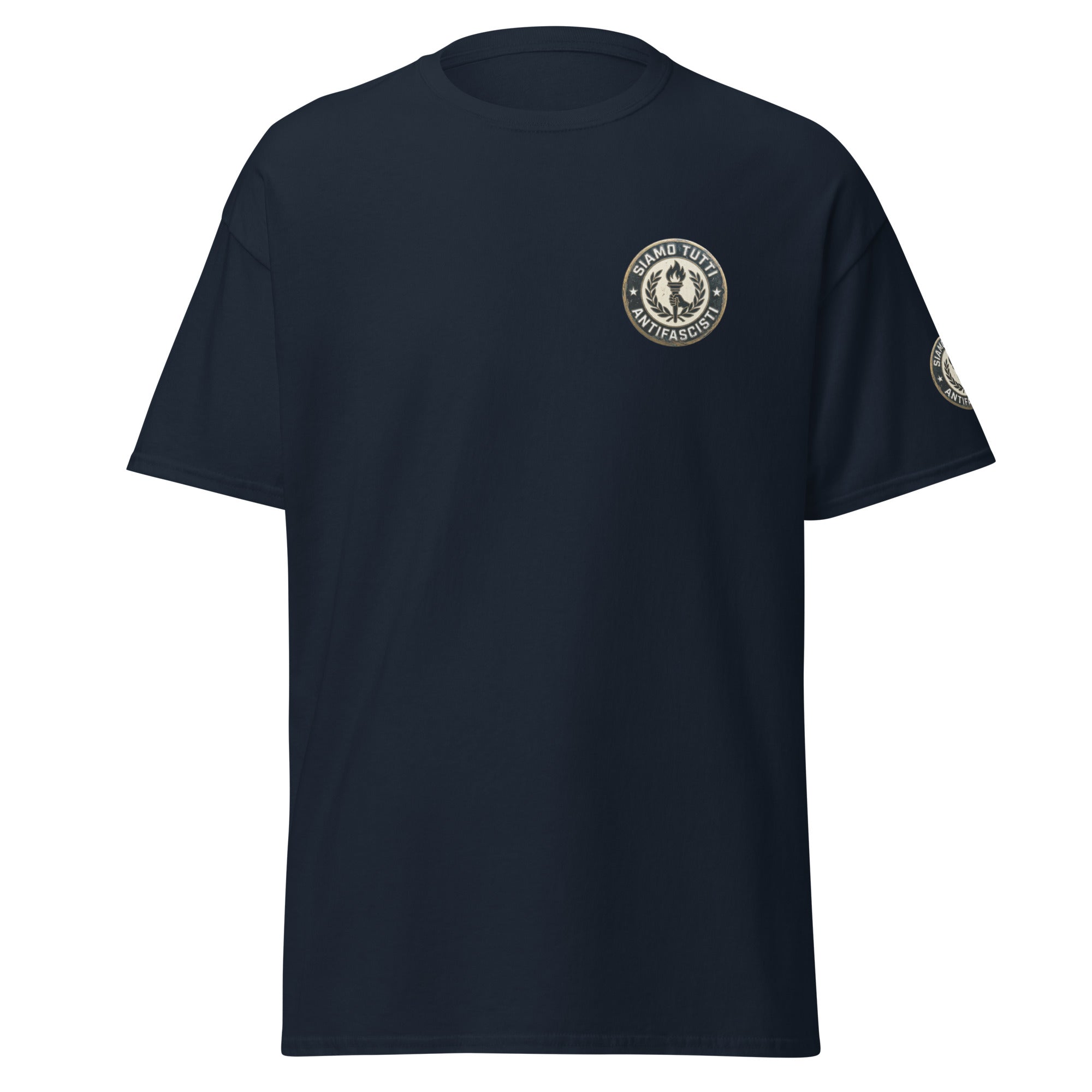 Antifaschismus Shirt – „Siamo Tutti Antifascisti“ Emblem mit Fackel & Lorbeerkranz – Unisex Statement T‑Shirt