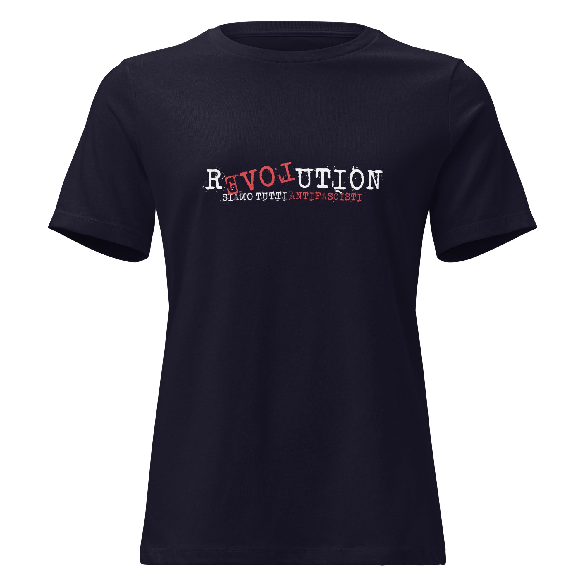 This women's T-shirt combines bold typography with a subtle wordplay aesthetic: The word LOVE is visually emphasized through red and white highlights, giving the design a double meaning. Below it is the Italian phrase "Siamo tutti antifascisti" – a clear, unifying message against fascism and for solidarity.