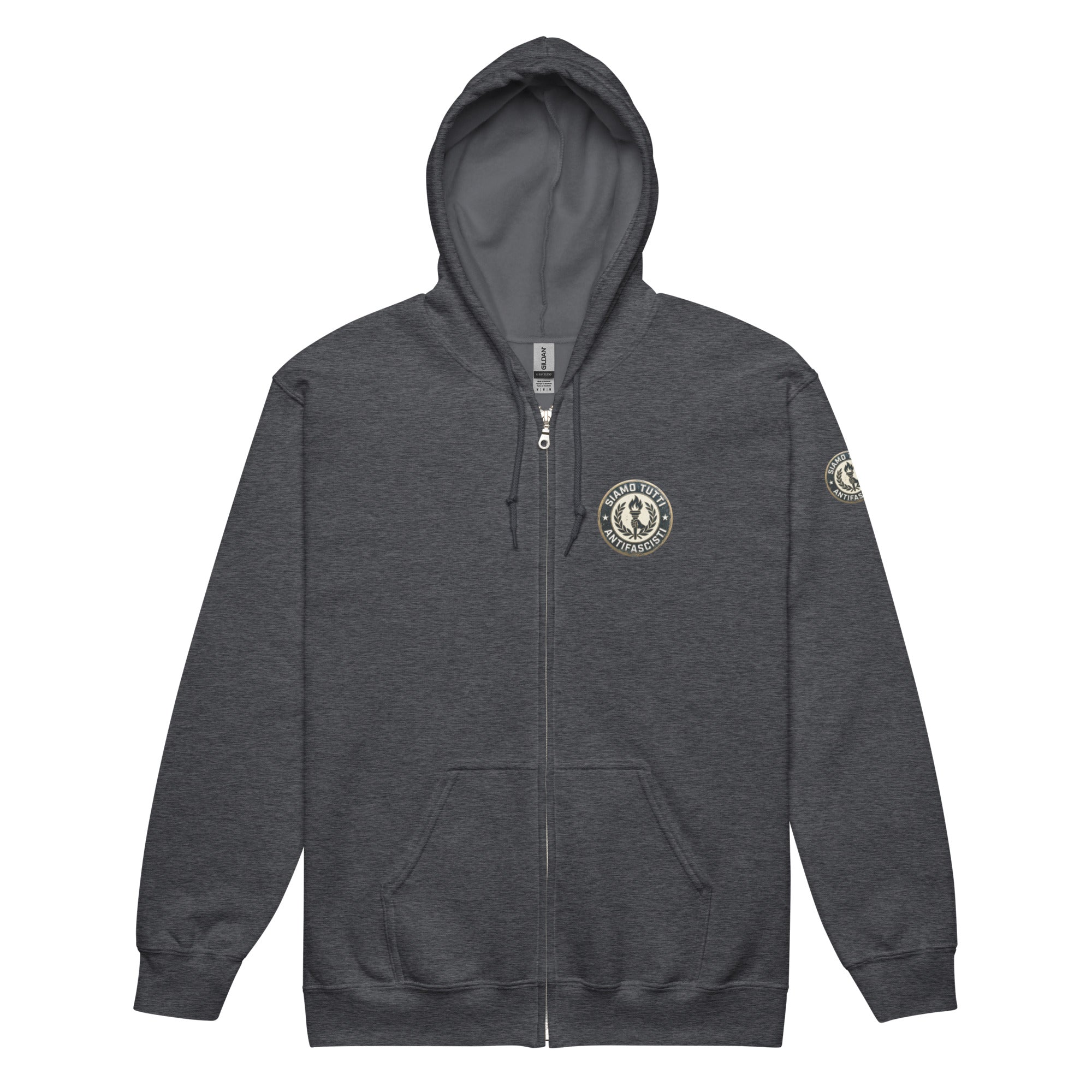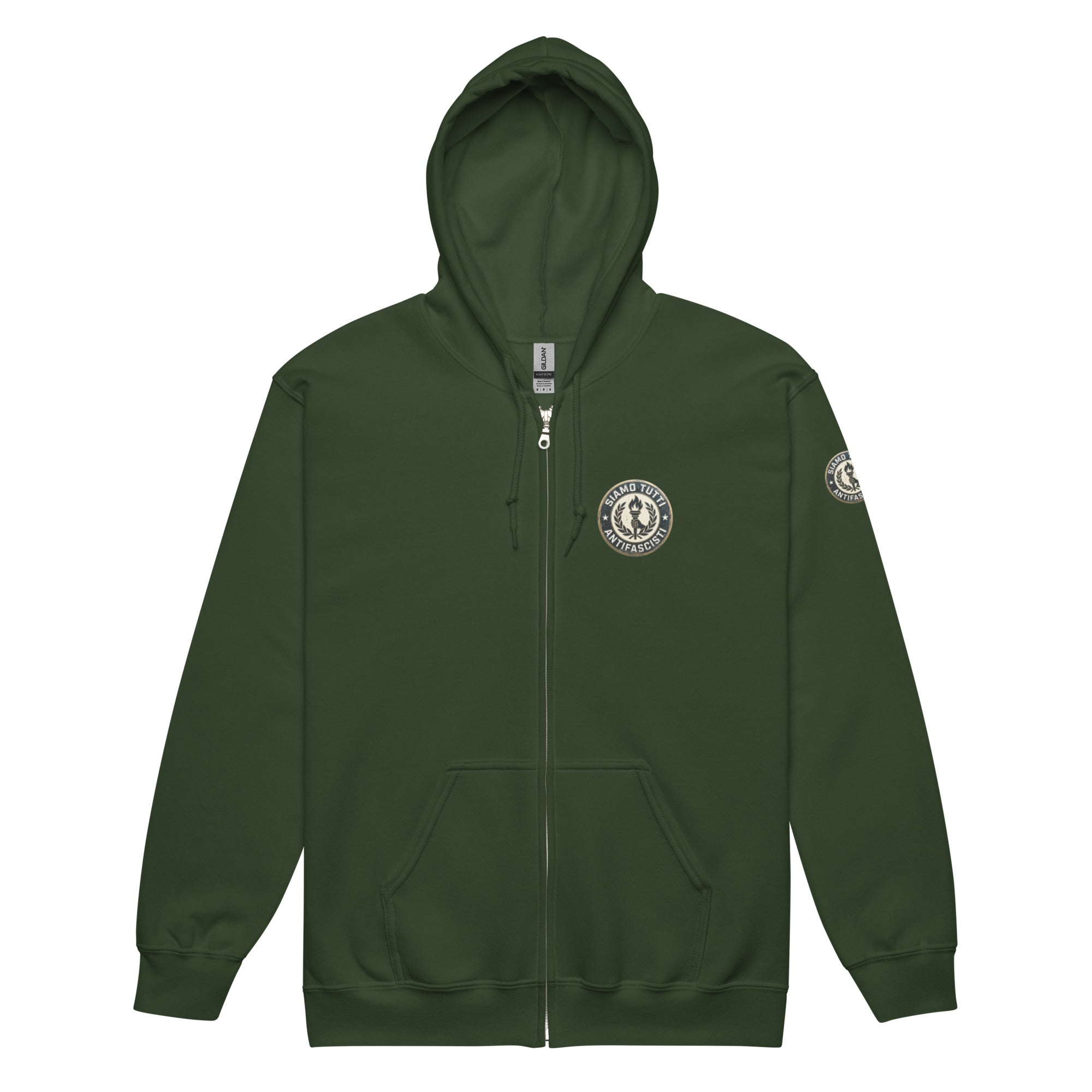 Antifaschismus Unisex Zip‑Hoodie – „Siamo Tutti Antifascisti“ Fackel‑Emblem & Lorbeerkranz